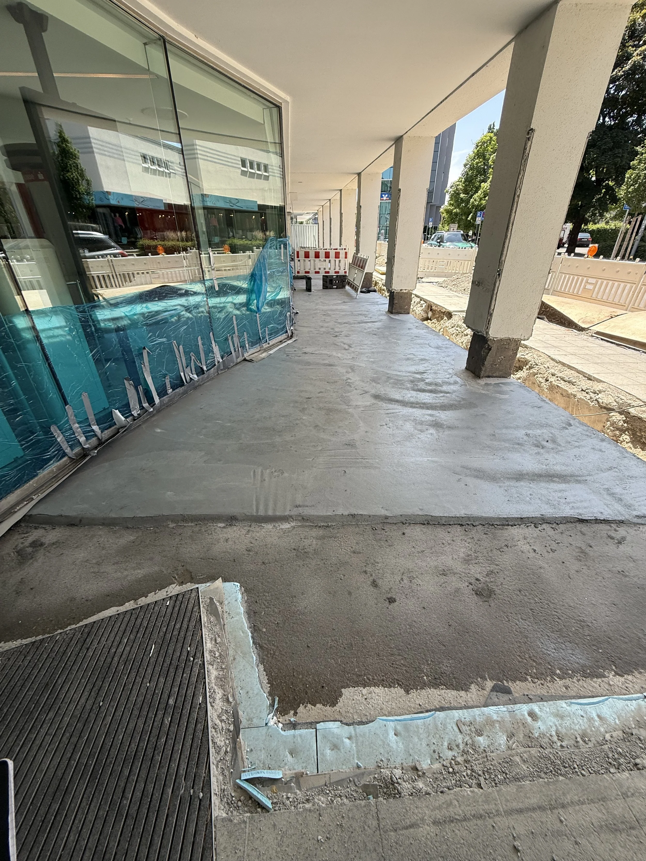 Im Zuge der Maßnahme wurden wandintegrierte und freistehende Stützen instandgesetzt, indem beschädigte Bereiche zurückgebaut, Stahlprofile entrostet, grundiert und mit Beton reprofiliert wurden. Die Kellerdecke erhielt eine vollflächige Abdichtung mit Bitumenbahnen. Zur gezielten Ableitung von Oberflächenwasser entlang der Fassade wurde eine Verdunstungsrinne integriert.