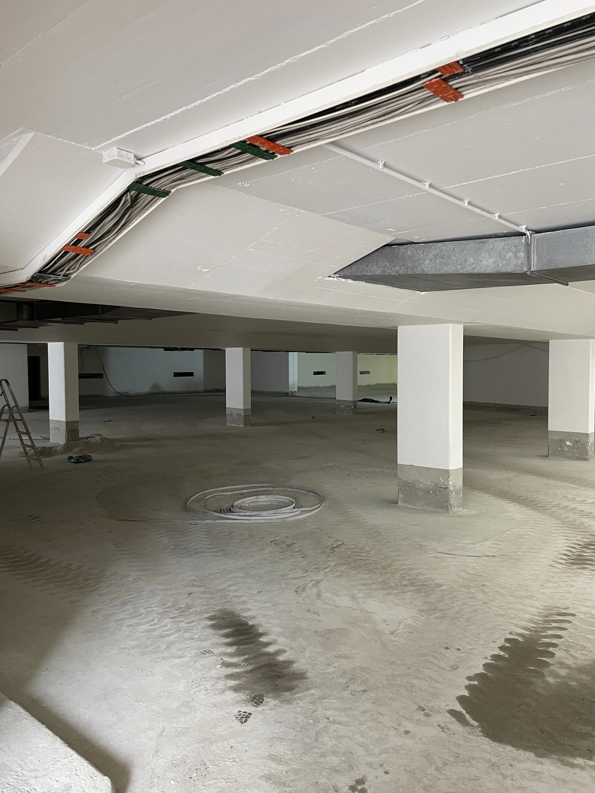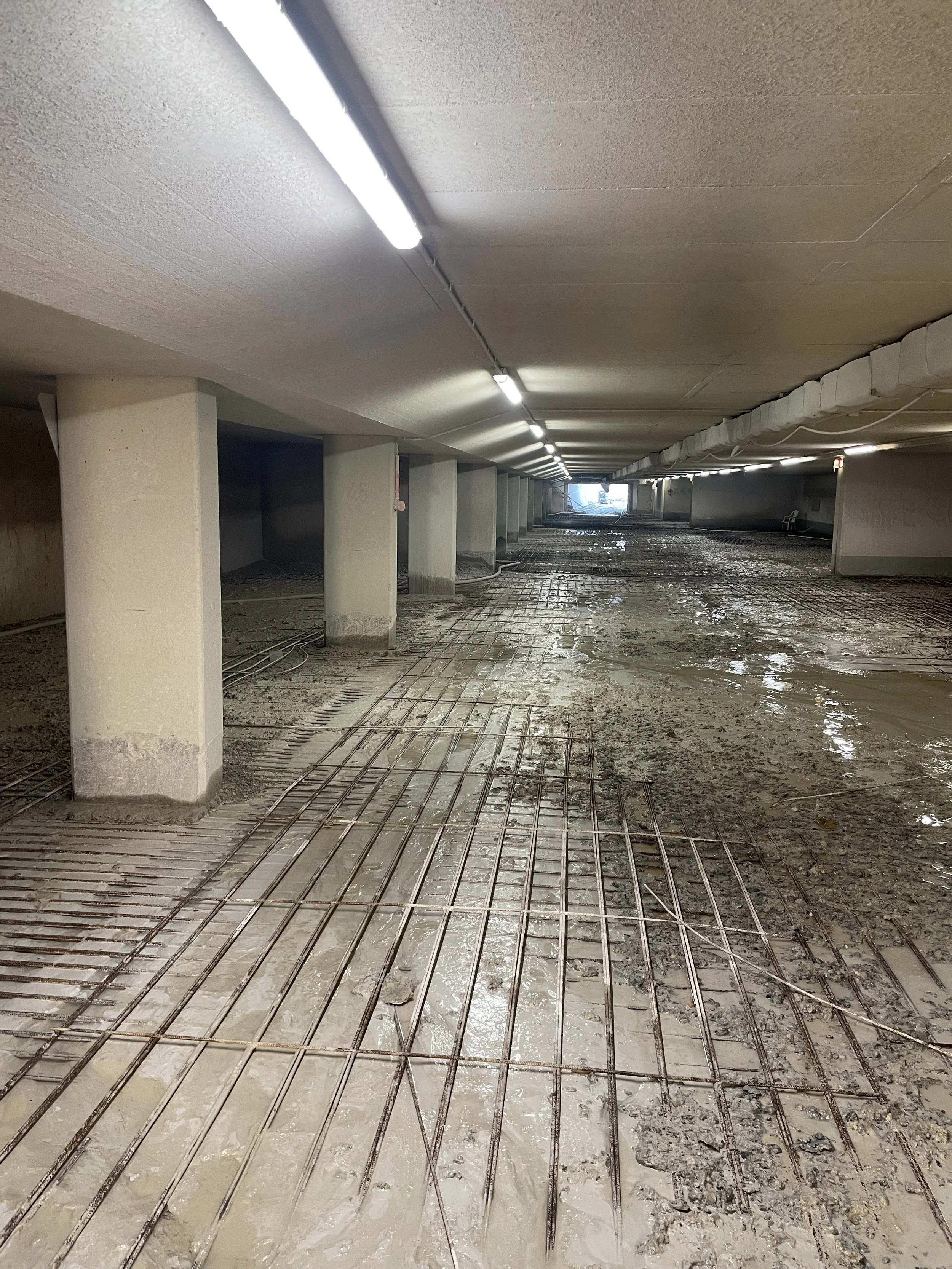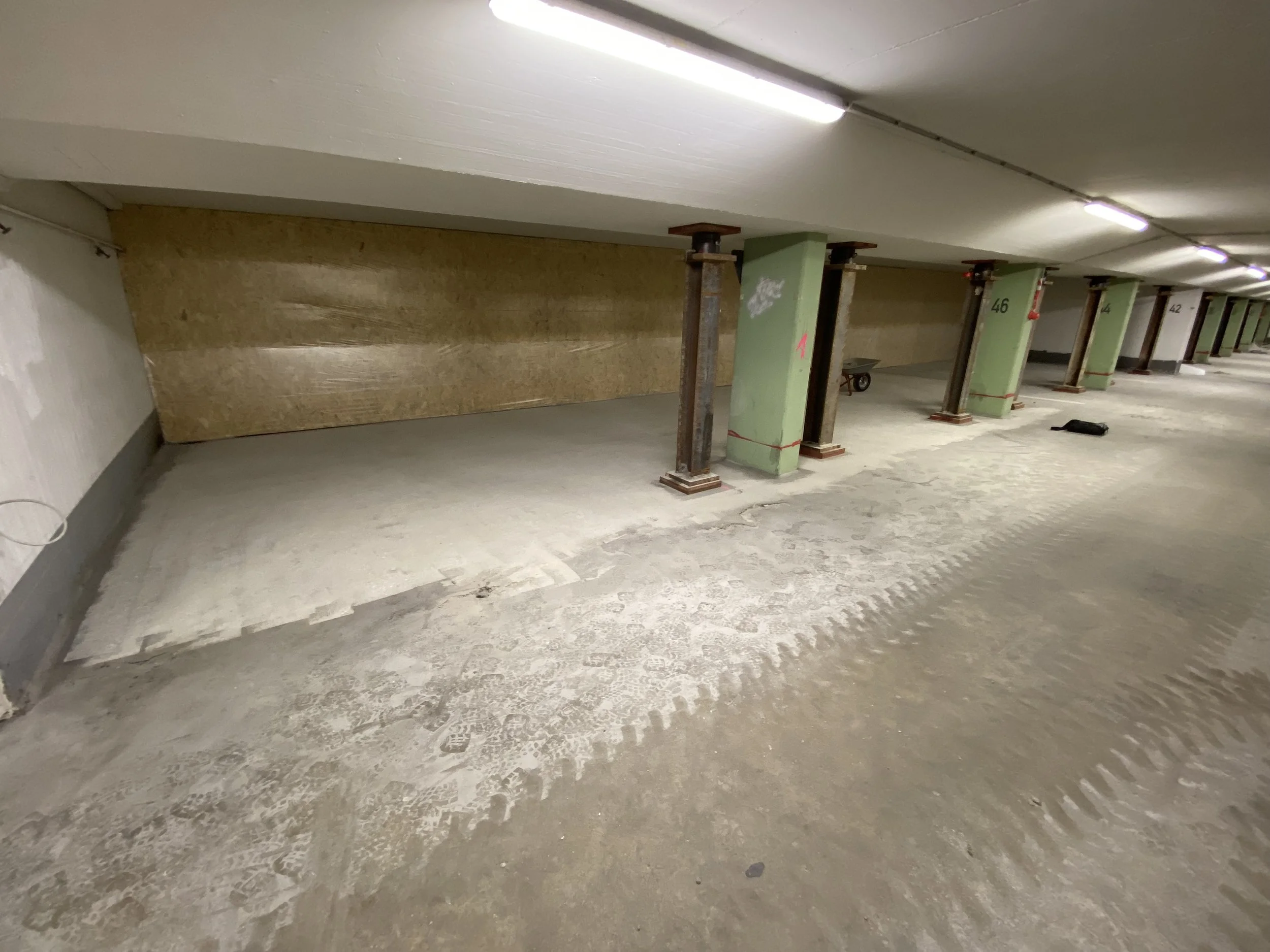 Während des laufenden Betriebs wurden beschädigte Betonflächen an Außenwänden, Stützen, Bodenplatte & Rampen abschnittsweise mit Hochdruckwasserstrahlen entfernt und instandgesetzt. Danach erhielten die Flächen passende Oberflächenschutzsysteme. Parallel optimierte man die Entwässerung, erneuerte Einläufe und stützte die Stützen vorübergehend ab.