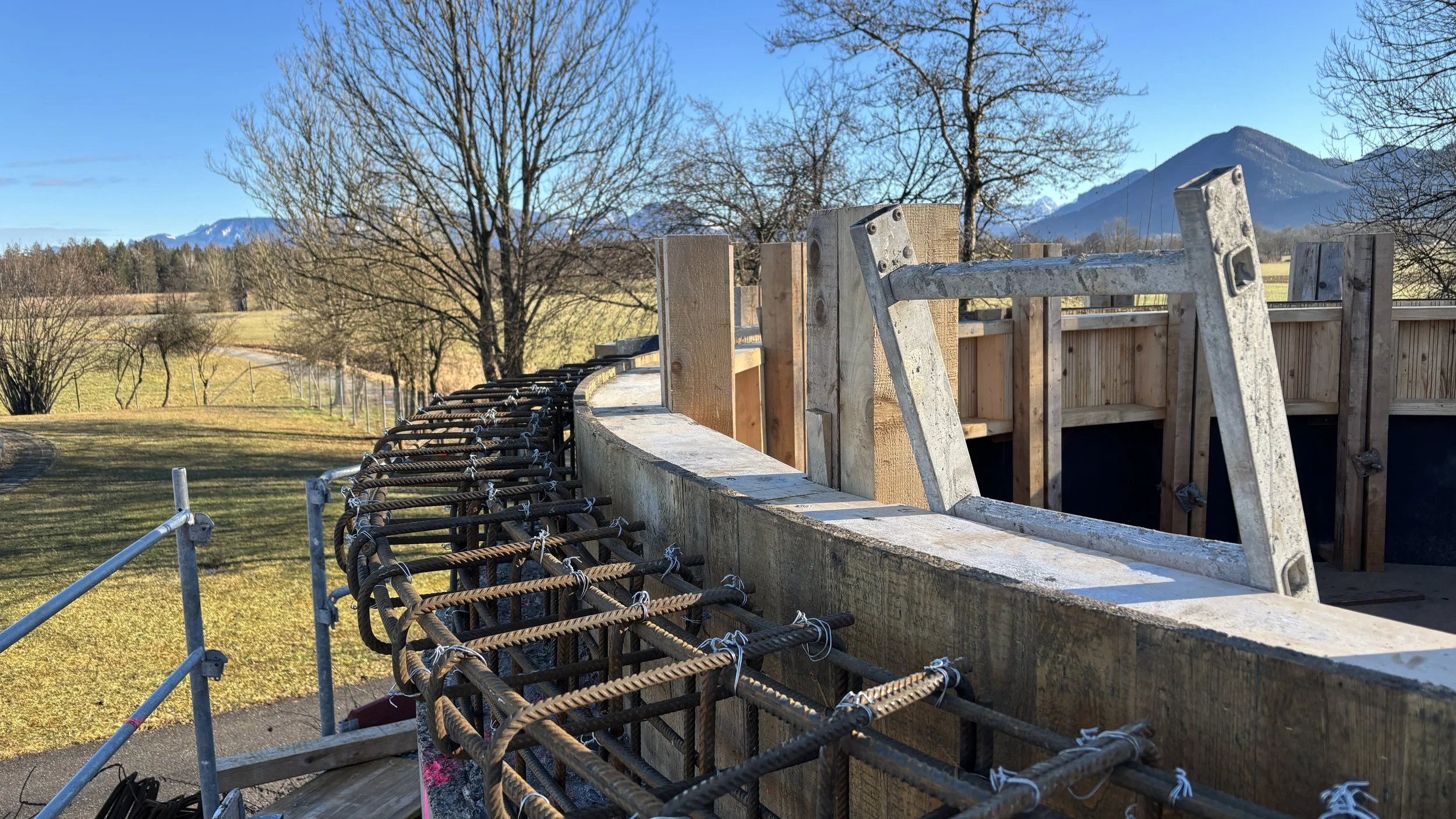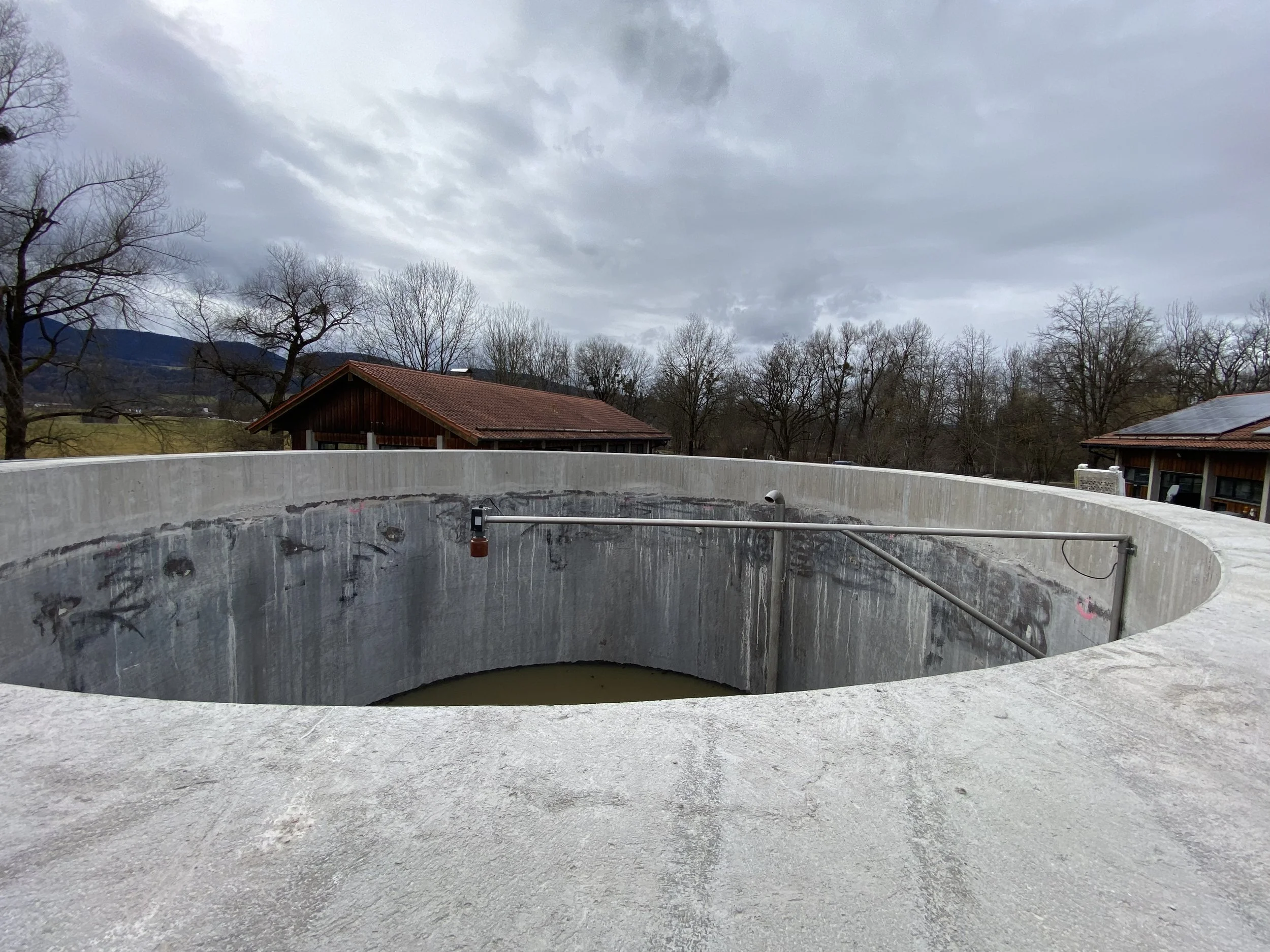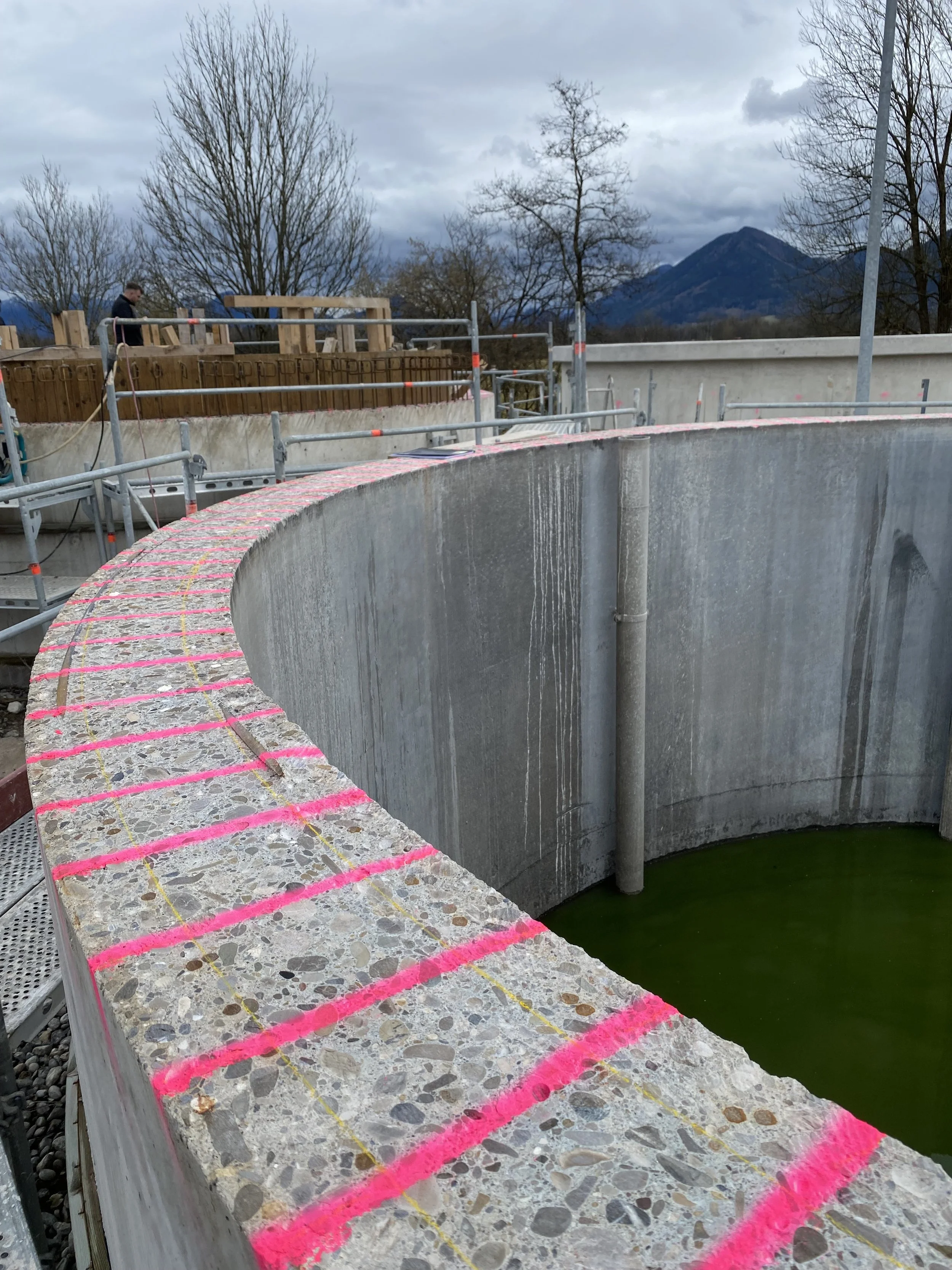 Im Zuge der Instandsetzung wurden die GFK-Abdeckungen der Dosierbehälter entfernt und entsorgt. Die Holzverkleidung an den Außenwänden wurde abgebaut, nach der Betoninstandsetzung wieder montiert. Die oberen 45 cm der Aufkantungen wurden zurückgebaut, neu bewehrt, betoniert und beschichtet.
